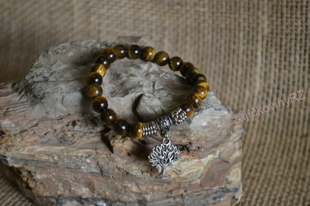 Náramek z minerálních kuliček, tygří oko, se stromem života, průměr kuličky 8 mm