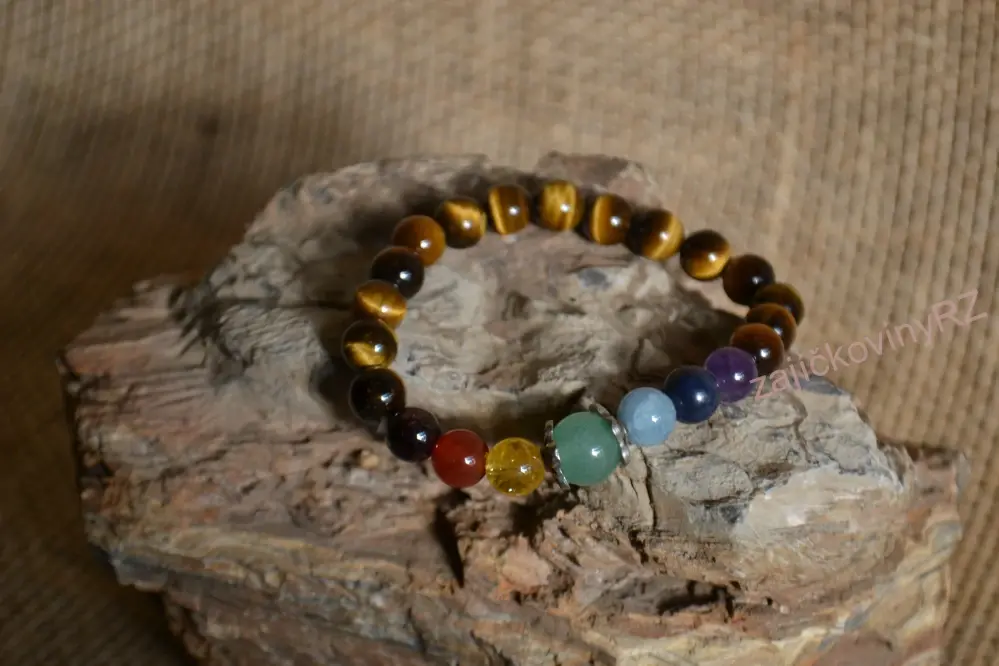 Náramek z minerálních kuliček, tygří oko, kuličky v barvách čaker, s doplňky z obecného kovu, průměr kuličky 8 mmSkladem 1 ks229 Kč/ ks189 Kč bez DPH