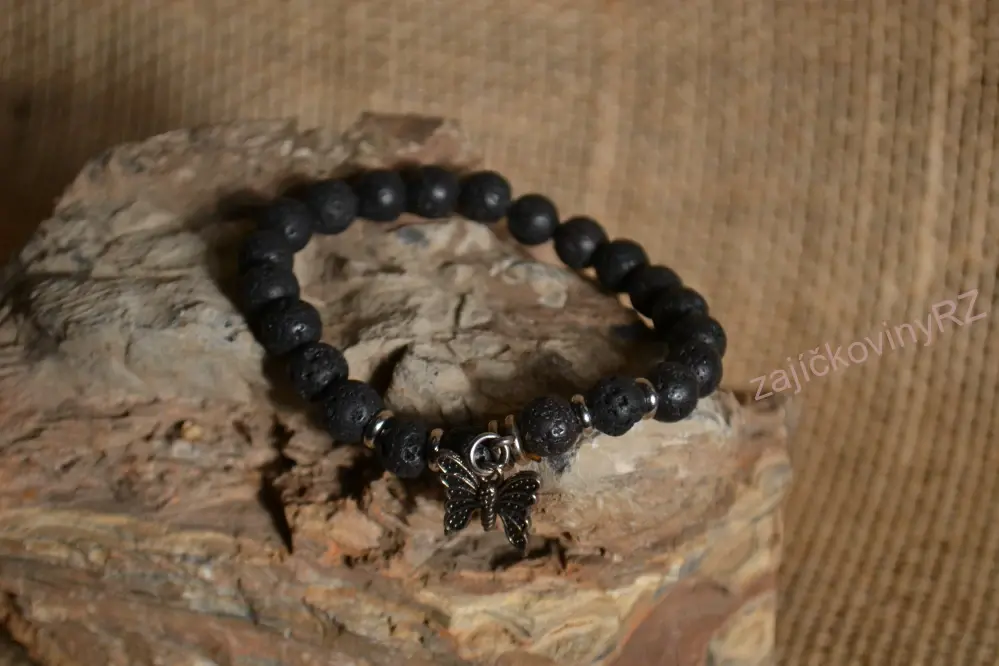 Náramek lávový, s kovovým přívěskem ve tvaru motýlka, průměr kuličky 8 mm