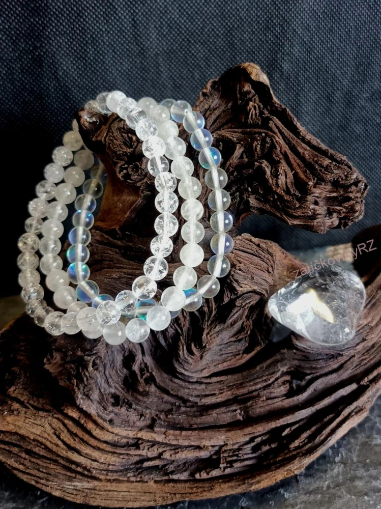 Náramky sada bílá 3 ks korálek 6 mm + 1 ks kámen křišťál, 3-4 cm