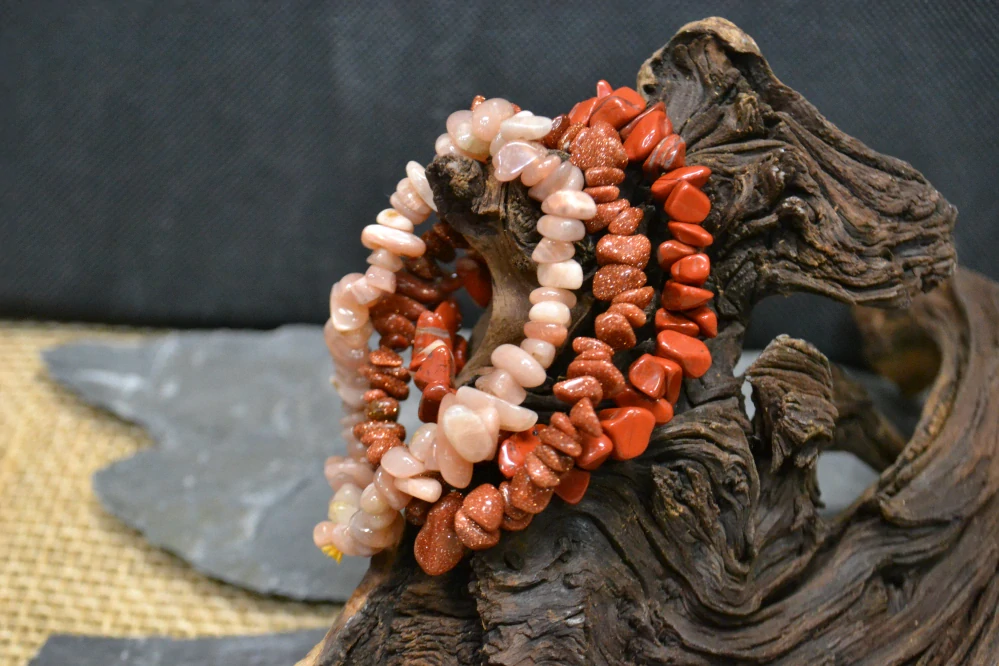 Náramek ze zlomků minerálů je navlečen na elastické gumičce, každý náramek je originál, dodaný kus se může lišit odstínem barvy a velikostí korálku a obvodu.