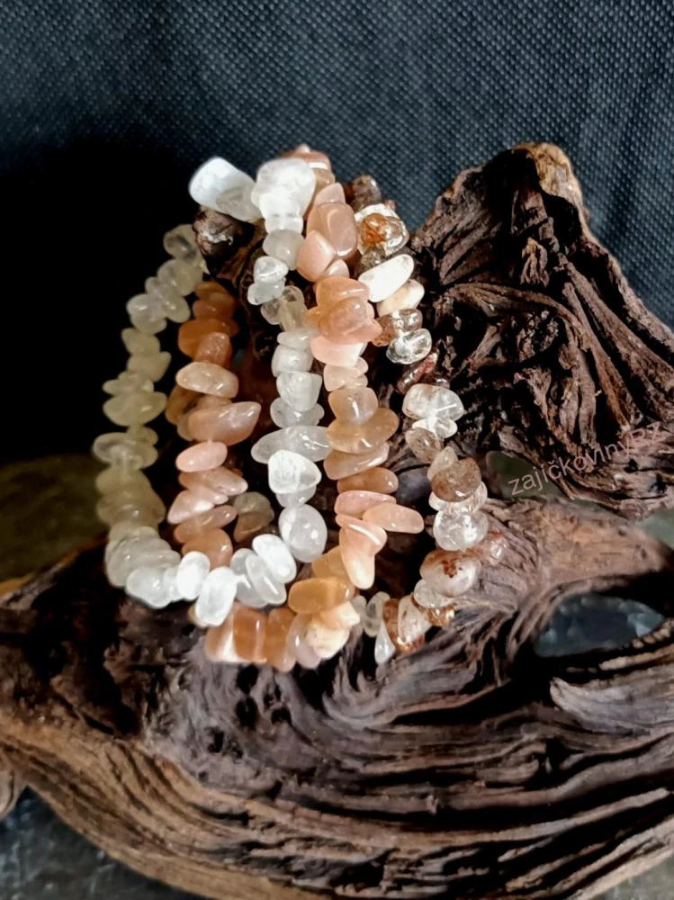 Náramek ze zlomků minerálů je navlečen na elastické gumičce, každý náramek je originál, dodaný kus se může lišit odstínem barvy a velikostí korálku a obvodu.
