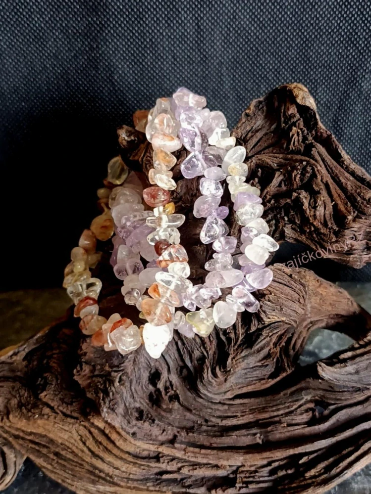 Náramek ze zlomků minerálů je navlečen na elastické gumičce, každý náramek je originál, dodaný kus se může lišit odstínem barvy a velikostí korálku a obvodu.