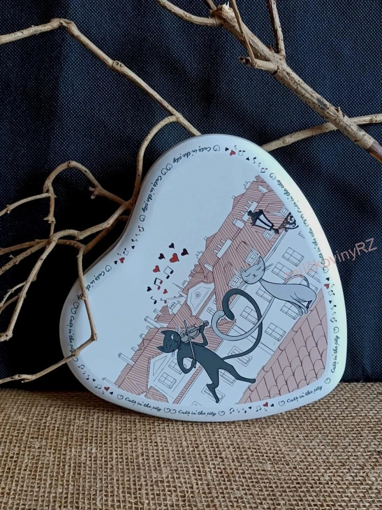 - Dóza plechové srdíčko, potisk kočky, 15,5 cm
