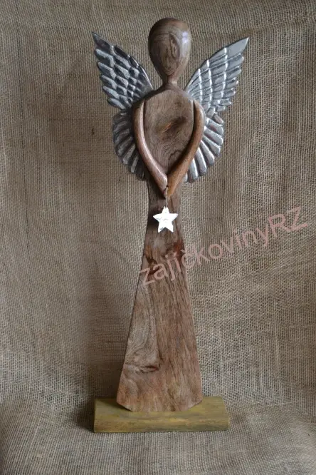 - Dřevěný anděl XXL, kovová křídla, STŘÍBRNÁ, 60 cm