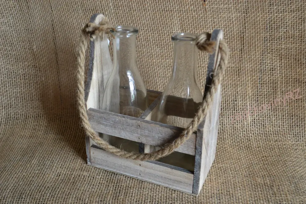 Dekorativní vázičky v dřevěném stojánku, obsahuje 2 skleněné vázičky, úchyt z jutového provazu.