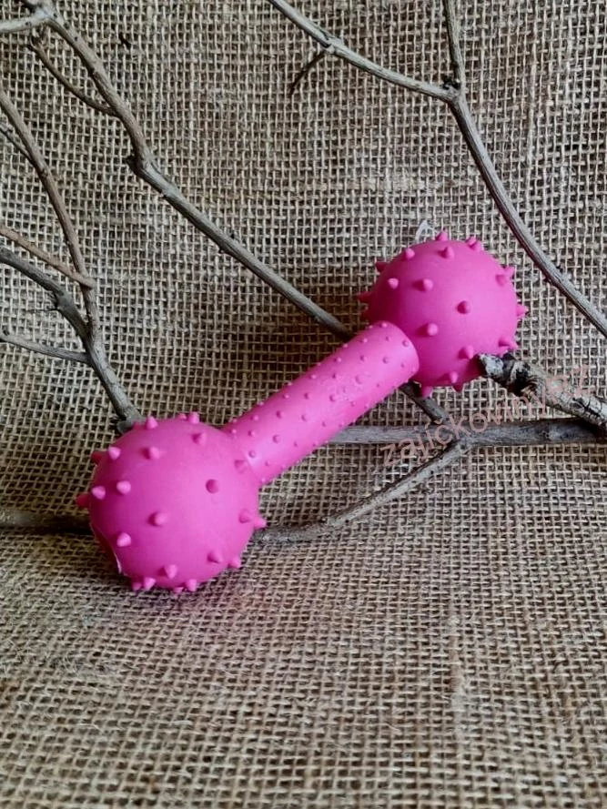 Měkká a ohebná růžová činka z termoplastické pryže, s rolničkou schovanou uvnitř.