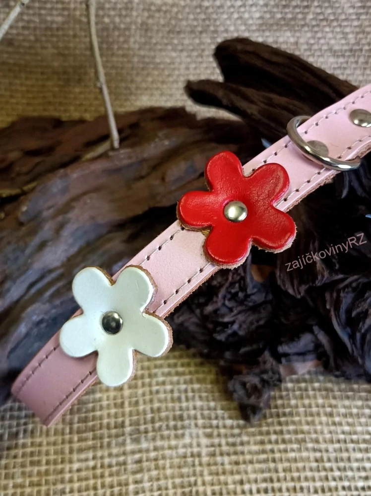Růžový kožený podšitý obojek zdobený čtyřmi barevnými květy z kůže. Pro připnutí karabiny od vodítka má obojek kovový kroužek. Obojek je vhodný pro malá plemena s obvodem krku do 34 cm.