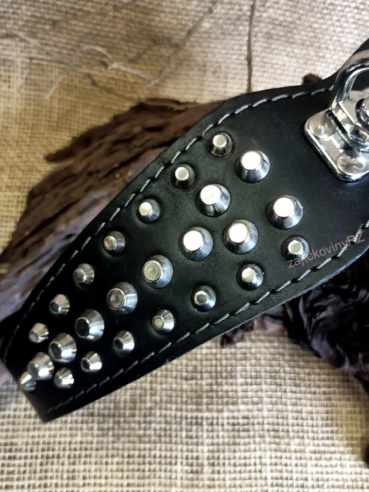 Velmi pevný kožený obojek TAIGA s vykrojením je podšitý semišovou kůží zdobenou stříbrnými kovovými kužely a je vhodný pro střední a velká plemena psů s obvodem krku maximálně 57 cm. Vždy se ujistěte, že obojek je dobře padnoucí a nepříliš těsný.
