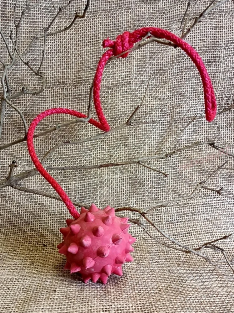 Míček 9 cm s ostny na dlouhé šňůře, vhodný k aportování a přetahování. Vyrobeno z tvrdé gumy, vhodné pro větší plemena psů. Barva podle dostupnosti skladu.