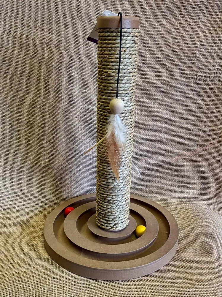 Pevná základna ze dřeva, s dvouřadou kuličkodráhou, se dvěma dřevěnými kuličkami, které lze snadno rozpohybovat tlapkou. Pro ještě větší radost z hraní je na sloupku zavěšená další dřevěná kulička s pírky, která podněcuje lovecký instinkt kočky. Sloupek je potažen lanem z mořské trávy.