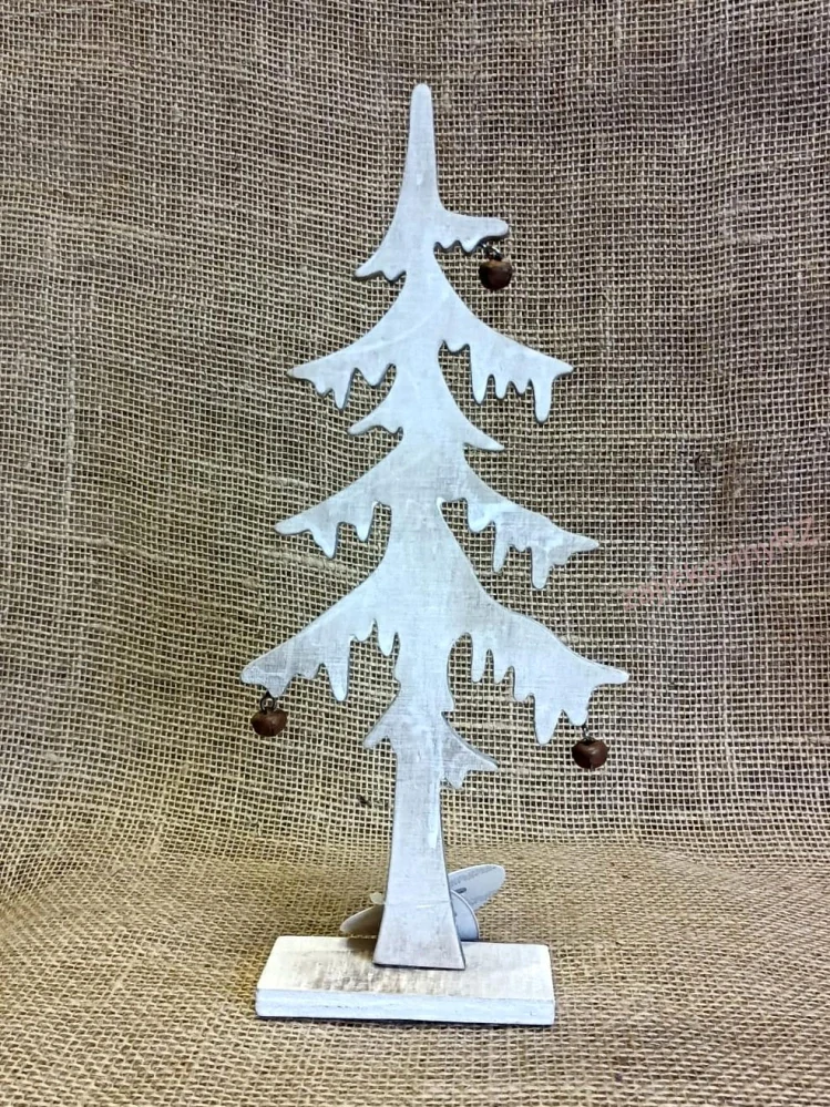 Dřevěný stromeček v béžové barvě, se třemi hnědými rolničkami, stojící na dřevěném podstavci. Vánoční bytová dekorace. Není hračka pro děti.