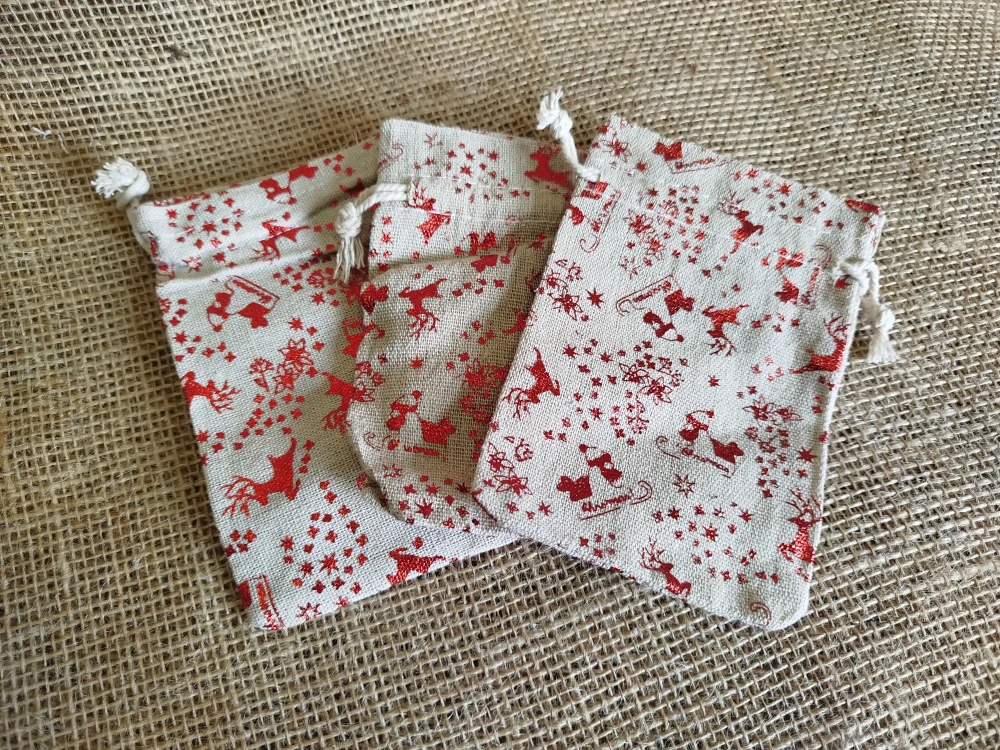 Béžový plátěný sáček s červenými vánočními motivy, vhodný na náramky, šperky, kameny či malé dárky. Není hračka pro děti.