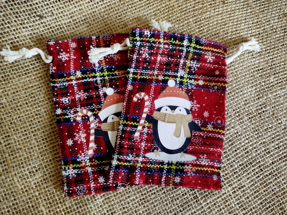 Červený jutový sáček s motivem roztomilého vánočního tučňáka, vhodný na náramky, šperky, kameny či malé dárky. Není hračka pro děti.