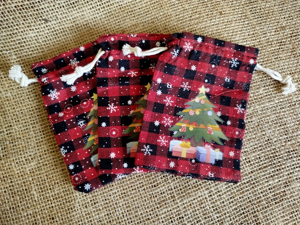 Červený jutový sáček s motivem vánočního stromečku, vhodný na náramky, šperky, kameny či malé dárky
