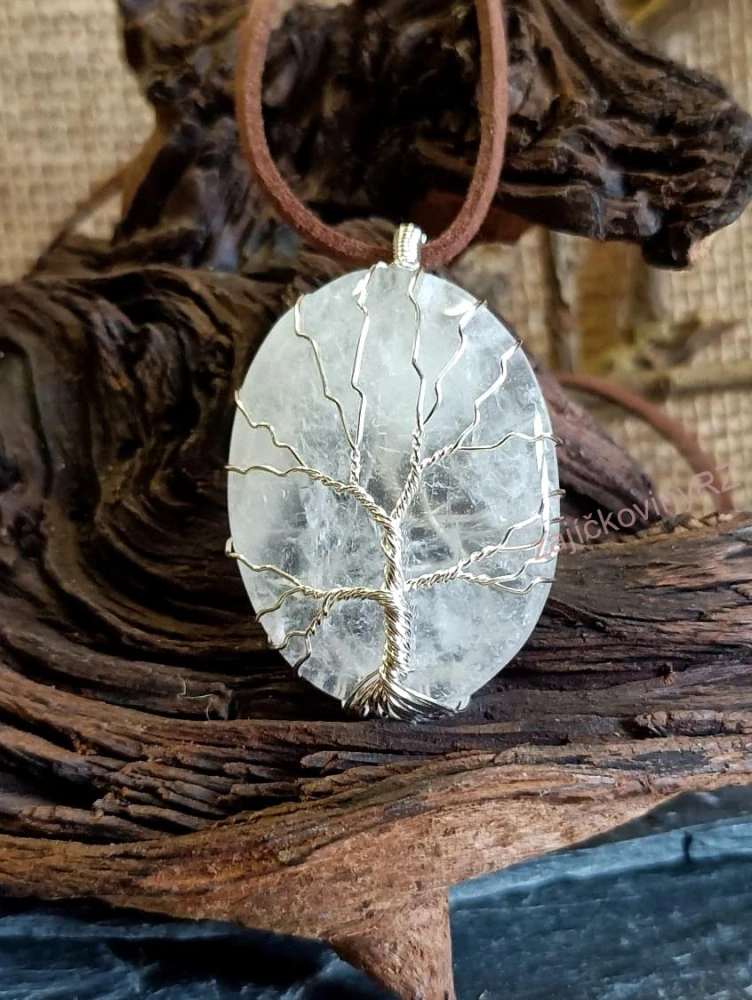 Krásný přívěsek z křišťálu, se stromem života z bižuterního drátku, včetně šňůrky z eko kůže. Křišťál je údajně považován za velmi účinný a universální krystal, zesiluje energii, uvolňuje a reguluje ji do absolutní harmonie, ochraňuje před vším zlým a negativním, harmonizuje, čistí a chrání auru. Vhodný pro meditace a magické účely.