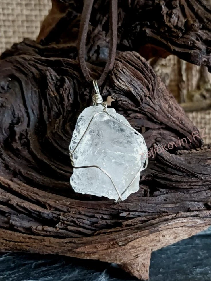 Krásný přívěsek ze surového křišťálu, s bižuterním drátkem, včetně šňůrky z eko kůže. Křišťál je údajně považován za velmi účinný a universální krystal, zesiluje energii, uvolňuje a reguluje ji do absolutní harmonie, ochraňuje před vším zlým a negativním, harmonizuje, čistí a chrání auru. Vhodný pro meditace a magické účely.