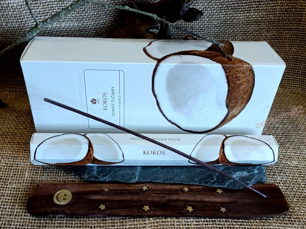 Vonné tyčinky Arôme provoní váš byt příjemnou vůní kokosu a navodí příjemnou atmosféru. Použití: umístěte tyčinku do dřevěného stojánku, zapalte, sfoukněte a nechte ji doutnat, popel dopadá na stojánek. Nenechávejte bez dozoru a ukládejte mimo dosah dětí.