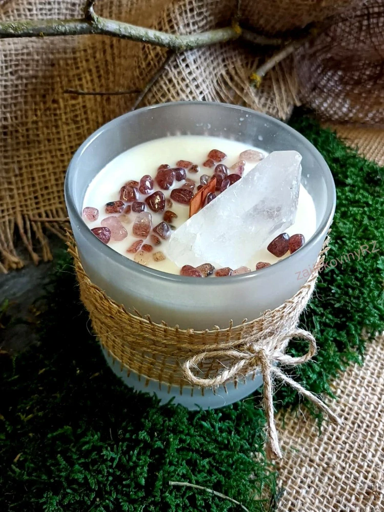 Křišťál je údajně považován za velmi účinný a universální krystal, zesiluje energii, uvolňuje a reguluje ji do absolutní harmonie, ochraňuje před vším zlým a negativním, harmonizuje, čistí a chrání auru. Vhodný pro meditace a magické účely. špatnými vlivy a zlem. Výběr kamenů ve svíčkách je náhodný. Křemen jahodový- zlomky- dodává sílu a energii k překování strachu, posiluje sebevědomí, dodává energii, ulevuje při zklamání a úzkostných stavech a v hledání vlastní cesty životem.