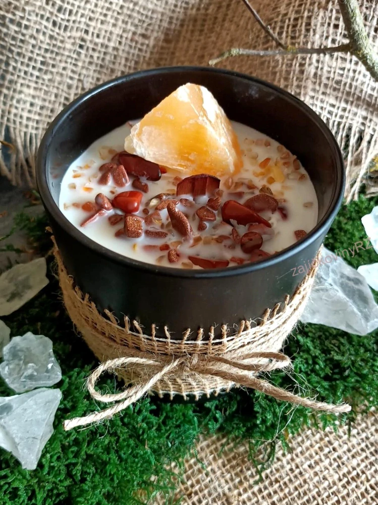 Vonná svíčka ze silného satinovaného skla různých barev, 100 % přírodní sójový vosk. Oranžový kalcit dle lidových tradic posiluje životní energii a chuť do života. Harmonizuje a uvádí do rovnováhy sakrální čakru. Traduje se, že přináší rozhodnost, sebedůvěru a činorodost. Barva kalcitů je ovlivněna přítomností různých kovů, jako je železo, měď nebo mangan. Karneol- zlomky-udává se, že se jedná o kámen s vysokou energií, stabilizuje, harmonizuje, dodává odvahu, klid a pozitivní pohled na život. Pomáhá potlačit vztek, deprese a negativní myšlenky. V některých kulturách se používá jako kámen povzbuzující sexuální aktivitu. Má jedinečnou oranžovočervenou barvu. Avanturín sluneční - zlomky- syntetický- je kamenem štěstí, prosperity a majetku, povzbuzuje kreativitu, zvyšuje vnímavost.
