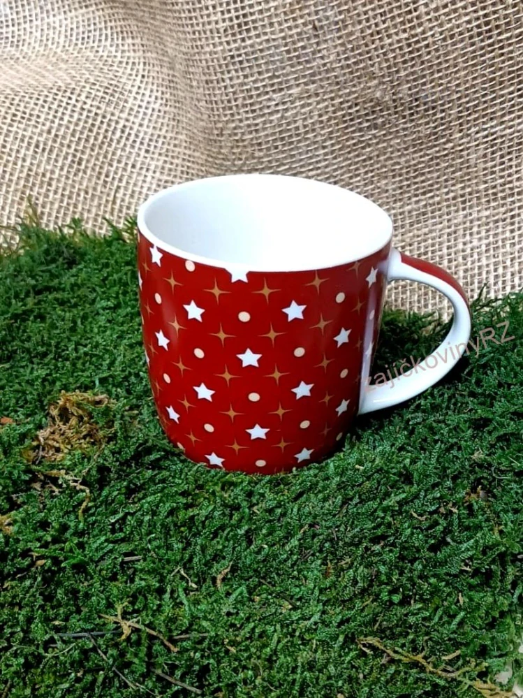Červený porcelánový hrnek s dekorem hvězdiček ozdobí váš stůl a přispěje k hezké vánoční atmosféře. V tradiční barvě, s tradičním dekorem- a vánoce mohou začít... Vlivem tepla může popraskat vnitřní glazura. Tekutiny, které barví, mohou vytvořit tmavé zbarvení uvnitř nádoby, což je klasický jev např.u keramických nádob - není na závadu.