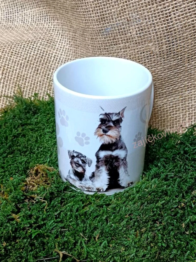 Krásný porcelánový hrnek s potiskem psích mazlíčků. Vlivem tepla může popraskat vnitřní glazura. Tekutiny, které barví, mohou vytvořit tmavé zbarvení uvnitř nádoby, což je klasický jev např. u keramických nádob - není na závadu, ani důvod k reklamaci.