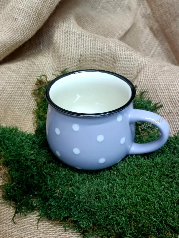 Velký keramický fialový hrnek s oblíbeným dekorem bílých puntíků. Drobné nedokonalosti povrchu jsou běžné u výrobků z keramiky. Vlivem tepla může popraskat vnitřní glazura. Tekutiny, které barví, mohou vytvořit tmavé zbarvení uvnitř nádoby, což je klasický jev u keramických nádob - není na závadu, ani důvodem k reklamaci.