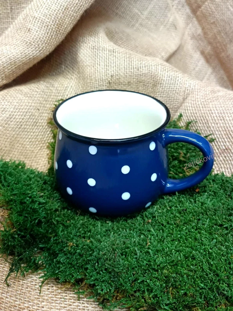 Velký keramický tmavě modrý hrnek s oblíbeným dekorem bílých puntíků. Drobné nedokonalosti povrchu jsou běžné u výrobků z keramiky. Vlivem tepla může popraskat vnitřní glazura. Tekutiny, které barví, mohou vytvořit tmavé zbarvení uvnitř nádoby, což je klasický jev u keramických nádob - není na závadu, ani důvodem k reklamaci.