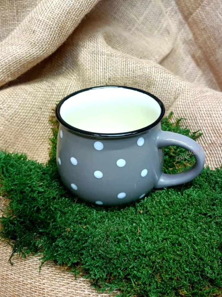 Krásný velký keramický šedý hrnek s oblíbeným dekorem bílých puntíků. Drobné nedokonalosti povrchu jsou běžné u výrobků z keramiky. Vlivem tepla může popraskat vnitřní glazura. Tekutiny, které barví, mohou vytvořit tmavé zbarvení uvnitř nádoby, což je klasický jev u keramických nádob - není na závadu, ani důvodem k reklamaci.