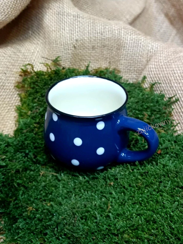 Malý keramický modrý hrnek s oblíbeným dekorem bílých puntíků. Drobné nedokonalosti povrchu jsou běžné u výrobků z keramiky. Vlivem tepla může popraskat vnitřní glazura. Tekutiny, které barví, mohou vytvořit tmavé zbarvení uvnitř nádoby, což je klasický jev u keramických nádob - není na závadu, ani důvodem k reklamaci.