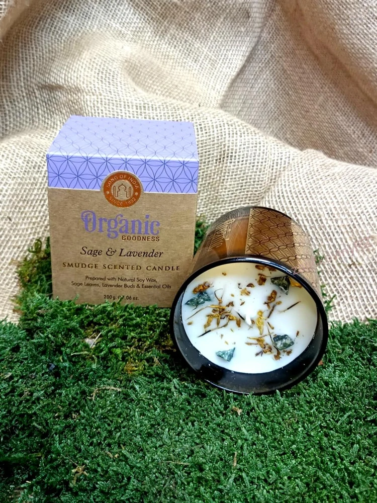 Sójové svíčky Organic Goodness jsou díky použitým esenciálním olejům vhodné pro aromaterapii a relaxaci. Květinová a aromatická vůně uklidňující levandule a očistné šalvěje je ideální při meditaci.