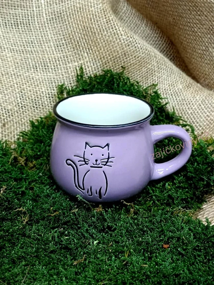 Menší keramický světle fialový hrnek s oblíbeným motivem koček. Krásný dáreček nejen pro milovníky zvířátek.