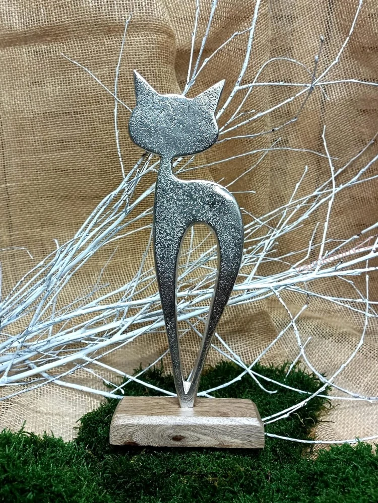 Krásná hliníková kočka na dřevěném podstavci. Bytová dekorace. Výrobek není hračka.