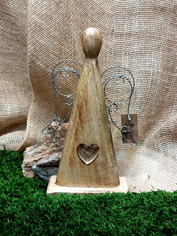 Andílek z mangového dřeva s drátěnými křídly. Andělé jsou považováni za posly dobra, světla a ochrany, proto patří mezi velmi oblíbené dekorace. Pomáhají navodit klidnou a harmonickou atmosféru a připomínají, že nikdy nejsme sami. Jsou symbolem ochrany, čistoty a nevinnosti, nebo prostě jen radostí z krásného uměleckého díla. Výrobek není hračka.