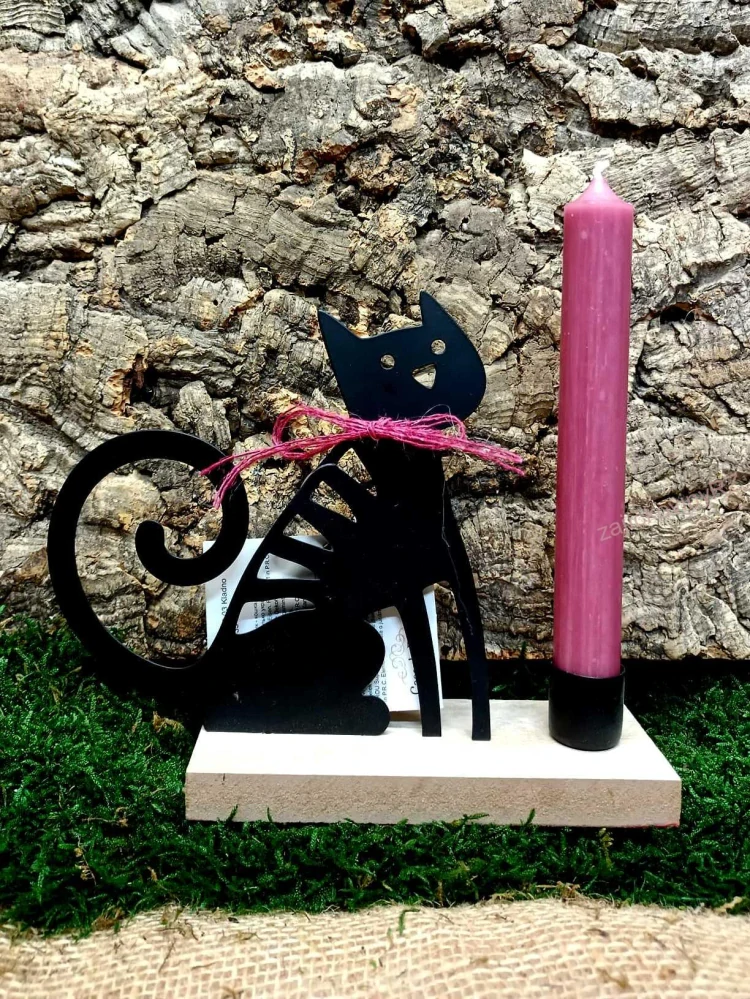 Kovový svícen ve tvaru černé kočky na dřevěném podstavci na stolní svíčku. Možno do poznámky uvést barvu svíčky (1-růžová na obrázku, 2- tm. fialová, 3- sv. levandulová, 4- sv. šedá, 5- béžová)