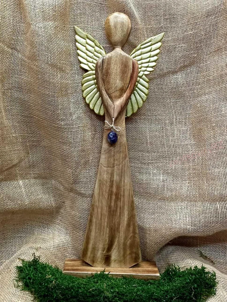Luxusní velký dřevěný anděl z mangového dřeva, se zlatými kovovými křídly a přívěskem z ametystu. Andělé jsou považováni za posly dobra, světla a ochrany, proto patří mezi velmi oblíbené dekorace. Pomáhají navodit klidnou a harmonickou atmosféru a připomínají, že nikdy nejsme sami. Jsou symbolem ochrany, čistoty a nevinnosti, nebo prostě jen radostí z krásného uměleckého díla. Ametyst je údajně považován za mimořádně mocný kámen s ochranou silou, je to kámen věrnosti, lásky, zahání nespavost, stres, negativní emoce, obavy, zvyšuje naději. Ilustrativní vyobrazení- přírodní materiály- ODSTÍN dřeva a TVAR minerálu se vždy liší, pokaždé však obdržíte zboží srovnatelné kvality. Nevystavovat vlhku. Výrobek není hračka.