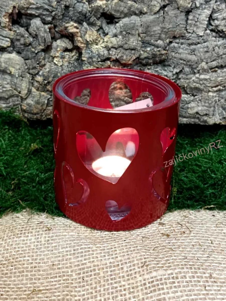 Krásný červený kovový svícen se srdíčky, se skleněnou nádobkou na čajovou svíčku uvnitř.