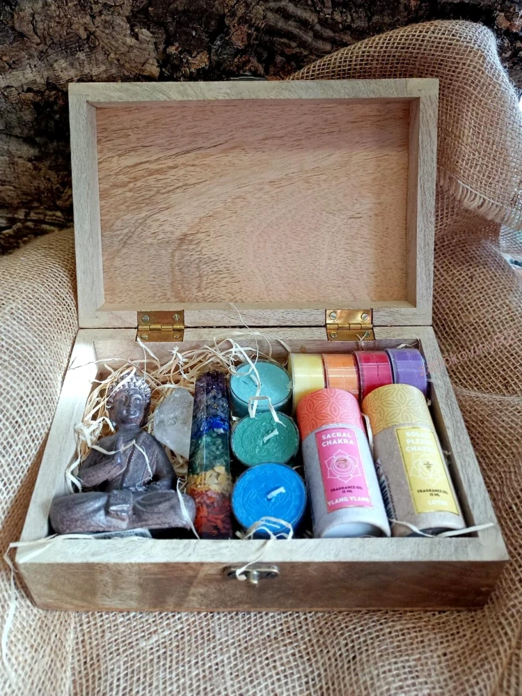 Krásná sada dvou vonných čakrových olejů a sedmi svíček, doplněná o sošku Buddhy, čakrový orgonit a hrot křišťálu. Krabička je z mangového dřeva s motivem mandaly.