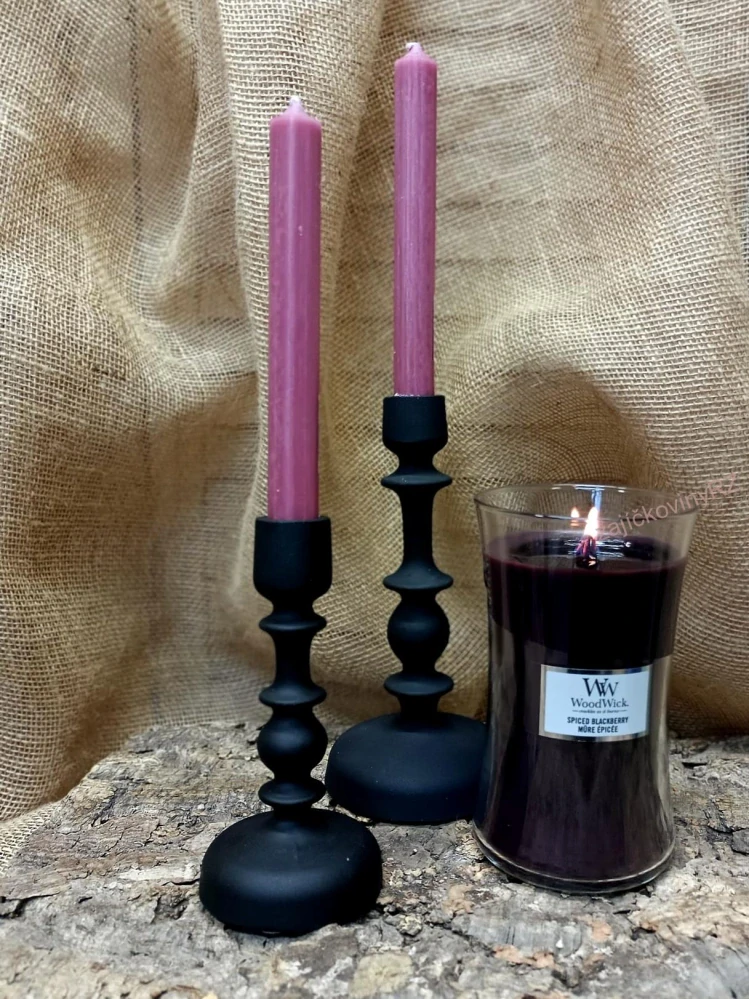 Barvu uveďte v poznámce, pokud neuvedete, obdržíte růžovou ( 1-RŮŽOVÁ na fotce, 2- TMAVĚ FIALOVÁ, 3-SVĚTLE LEVANDULOVÁ, 4-SVĚTLE ŠEDÁ, 5- BÉŽOVÁ ). Luxusní sada se skládá ze dvou kovových svícnů velikosti 21 a 16 cm, dvou stolních svíček volitelné barvy a 1x velké svíčky WoodWick 609 g Spiced Blackberry.