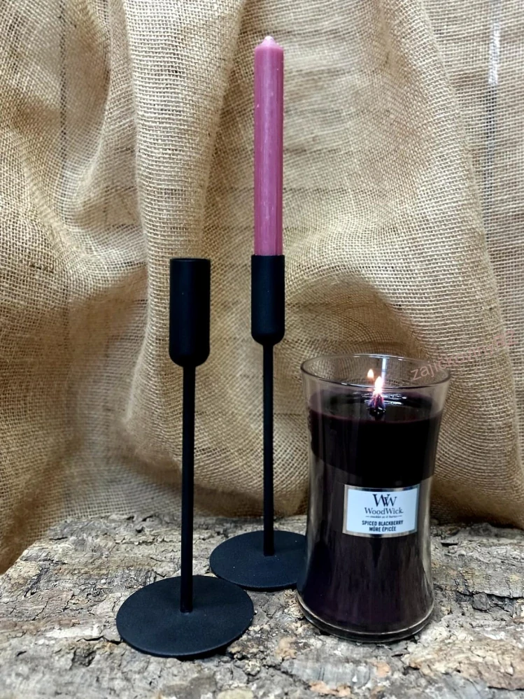 Luxusní sada č.2 se skládá ze dvou stejných kovových svícnů o velikosti 24 cm, dvou stolních svíček volitelné barvy a 1x velké svíčky WoodWick 609 g Spiced Blackberry. Barvu stolních svíček uveďte v poznámce, pokud neuvedete, obdržíte růžovou ( 1-RŮŽOVÁ na fotce, 2- TMAVĚ FIALOVÁ, 3-SVĚTLE LEVANDULOVÁ, 4-SVĚTLE ŠEDÁ, 5- BÉŽOVÁ ).