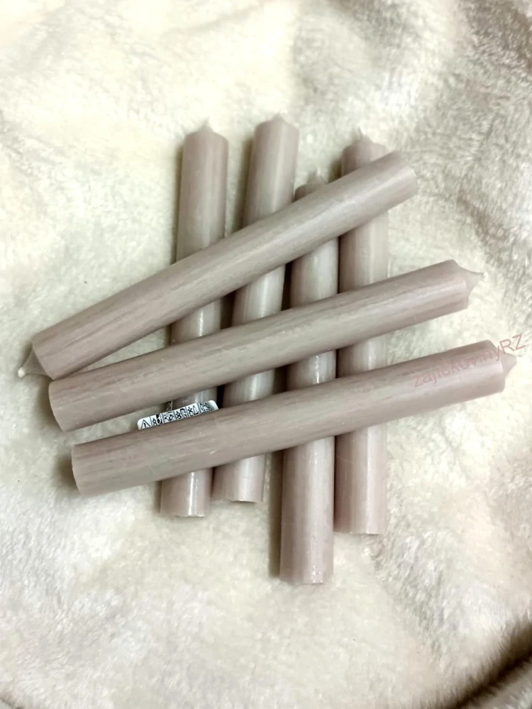 Stolní béžová parafínová svíčka bez vůně. Hoří beze zbytku.