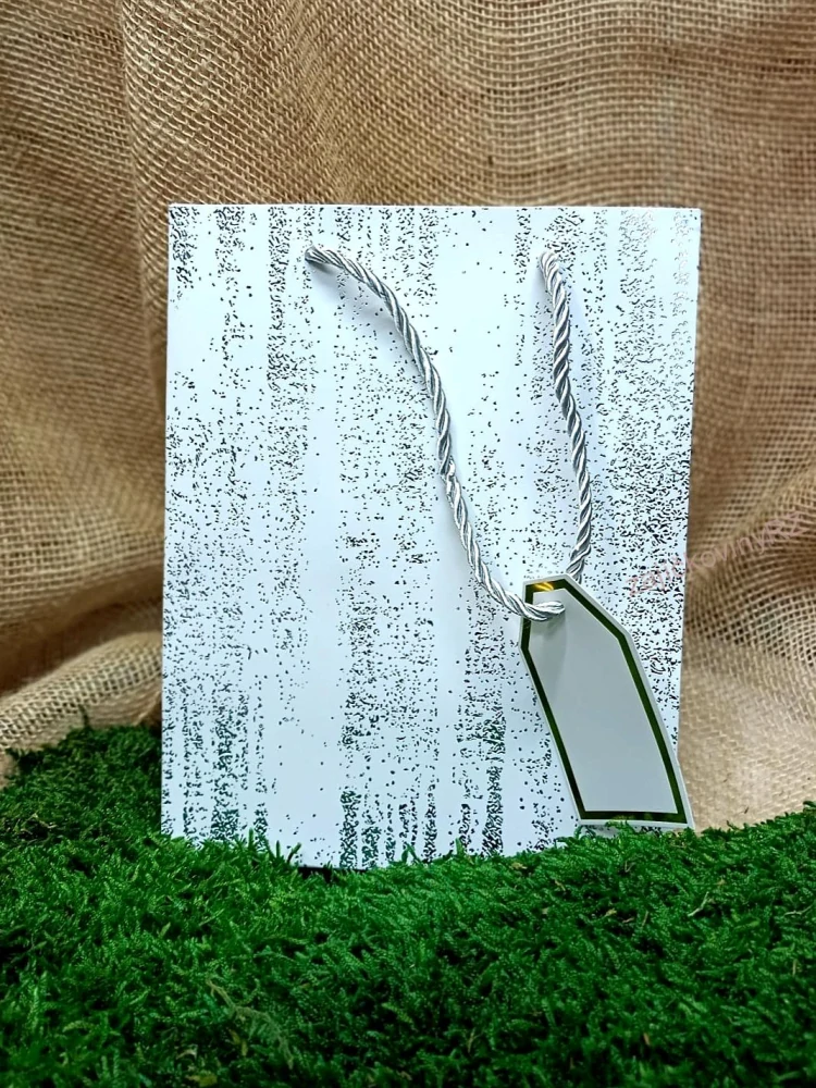Dárková papírová taška, bílá se stříbrnými proužky a s provázkovými uchy. Není hračka pro děti.