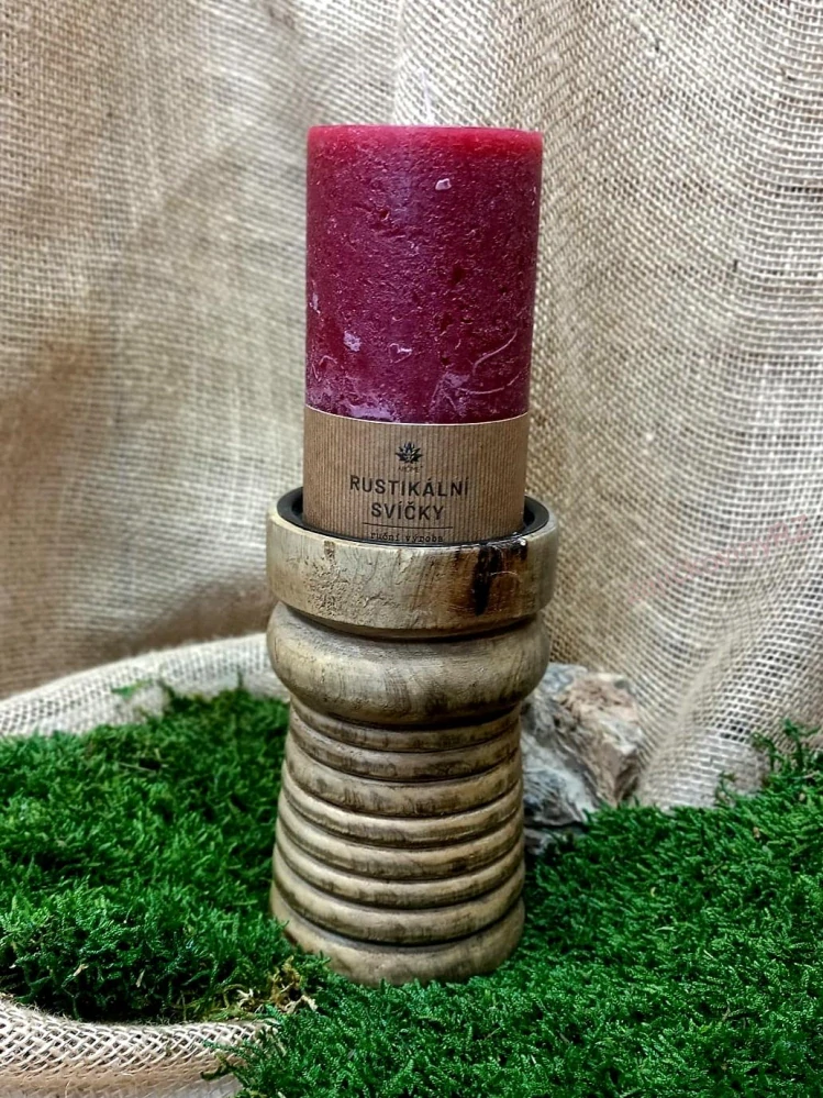 Krásný masivní svícen ze světlého mangového dřeva s vínovou ručně vyrobenou svíčkou. Uvnitř kalíšek z hliníku pro snadnější a bezpečnější umístění svíčky.