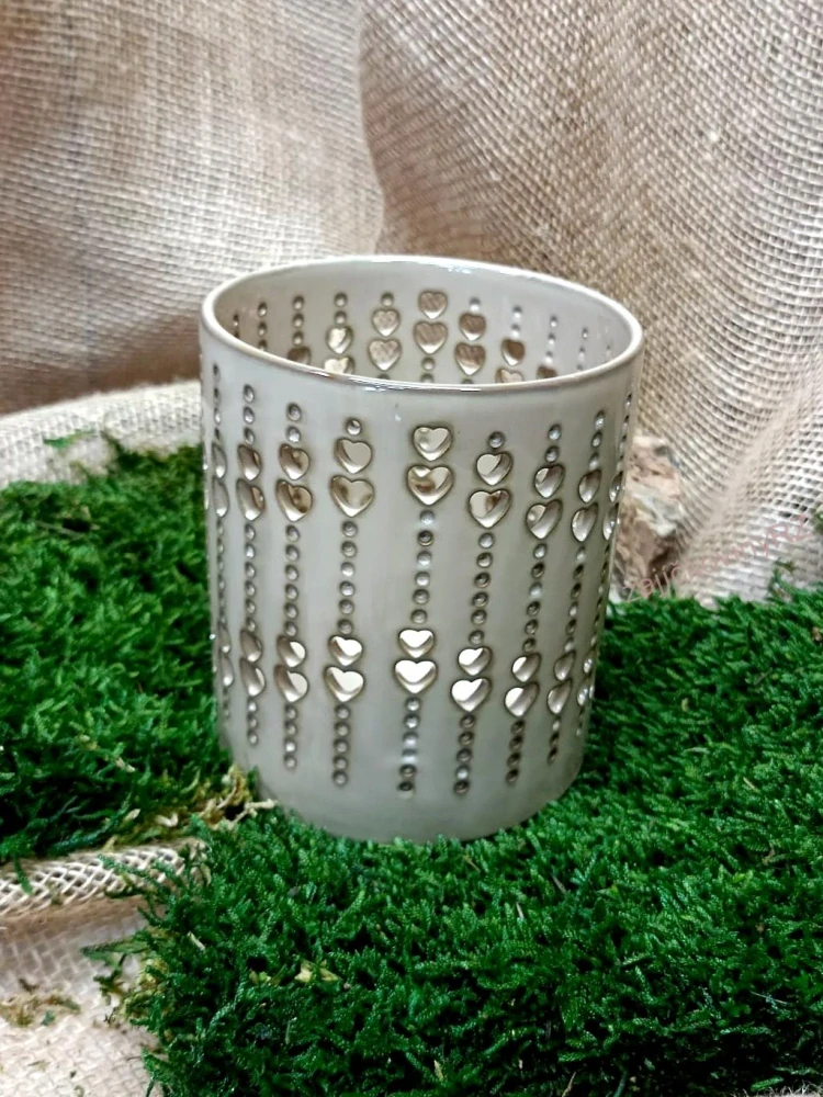 Krásný moderní jednoduchý porcelánový svícen s průřezy srdíček. Na čajovou svíčku.
