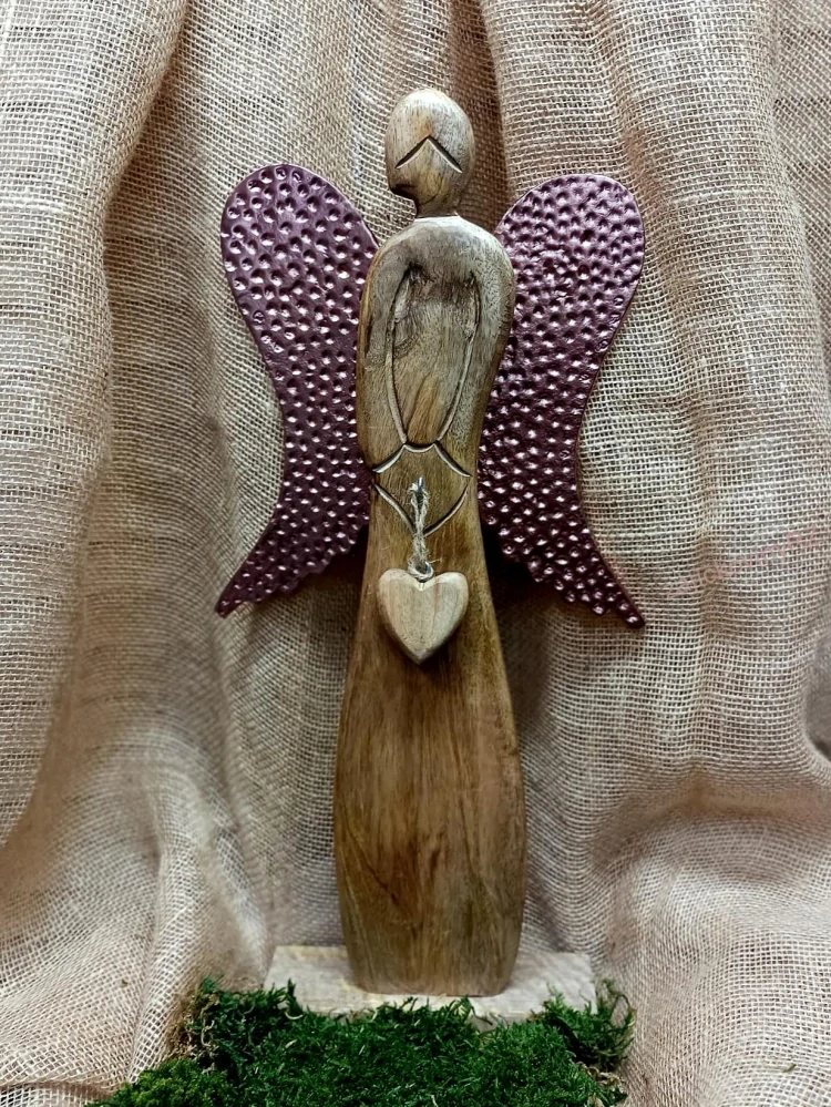 Dřevěný anděl XL, kovová křídla, MĚDĚNÁ, SRDCE, 50 cm