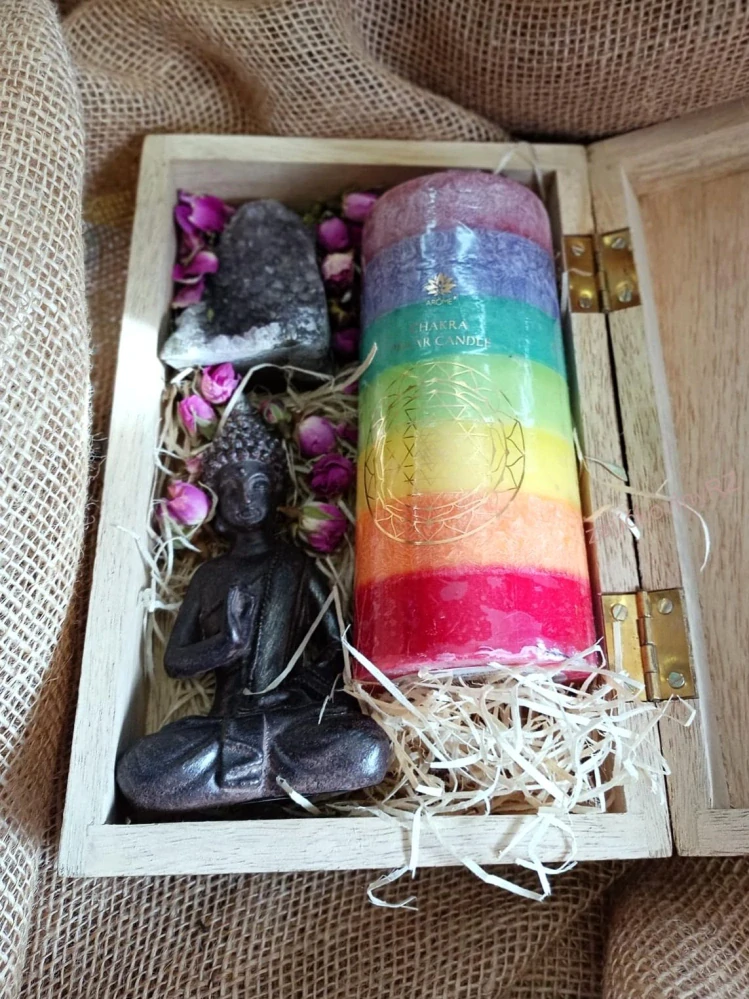 Krásná krabička s mandalou z mangového dřeva. Čakrová svíčka je určena pro meditaci, relaxaci a k obnovení harmonie a duševní pohody. Soška Buddhy symbolizuje mír, osvícení, klid, štěstí a konečný duchovní cíl osvícení. Ametyst je údajně považován za mimořádně mocný kámen s ochranou silou, je to kámen věrnosti, lásky, zahání nespavost, stres, negativní emoce, obavy, zvyšuje naději.